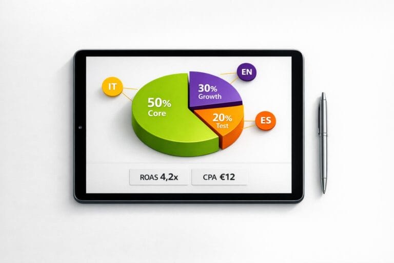 Dopo aver identificato i mercati target, è il momento di definire il budget complessivo in base ai tuoi obiettivi. Che si tratti di massimizzare il ROAS, aumentare il traffico o sostenere la crescita, il metodo di calcolo deve adattarsi alle peculiarità di ogni mercato e lingua.